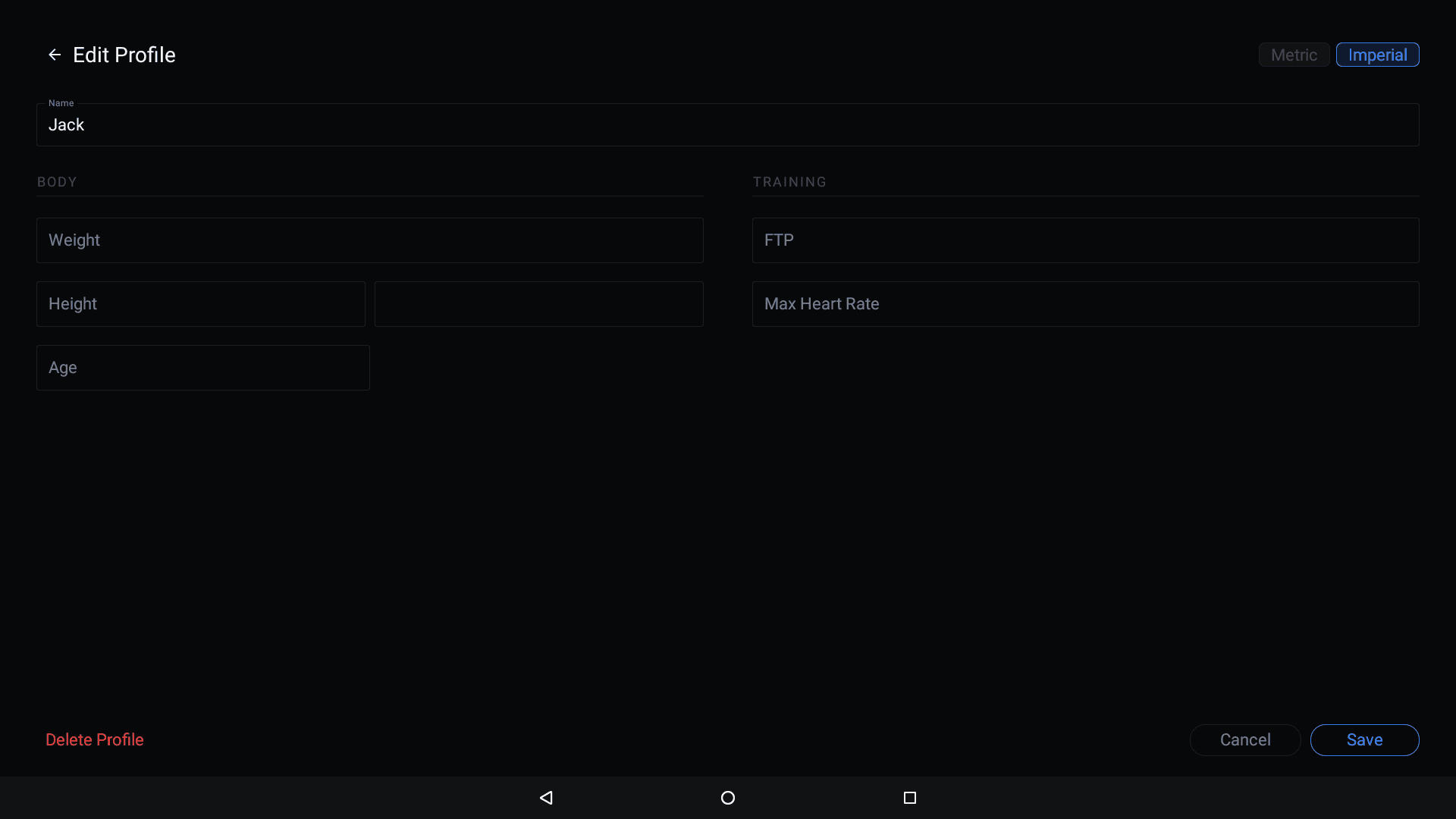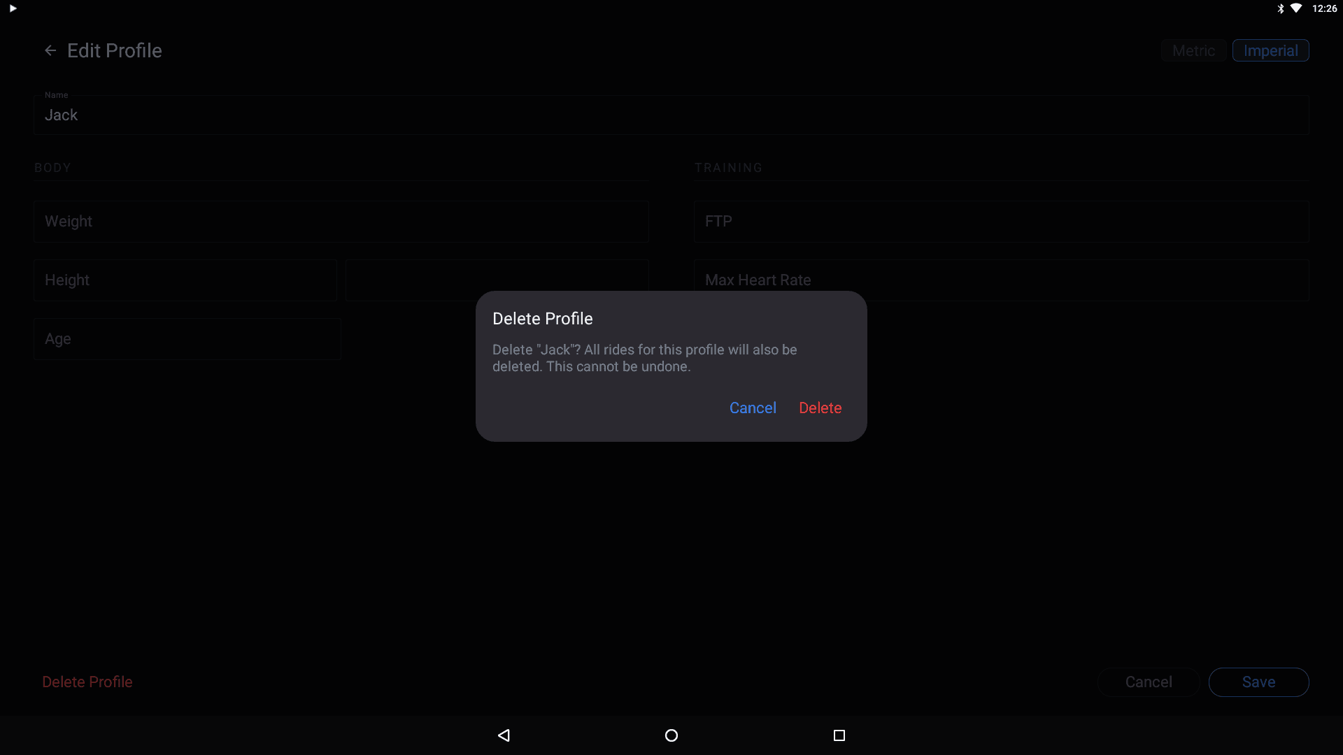 Tap Delete Profile (in red) at the bottom-left of the Edit Profile screen. A confirmation dialog will appear warning that all rides for the profile will also be deleted.
