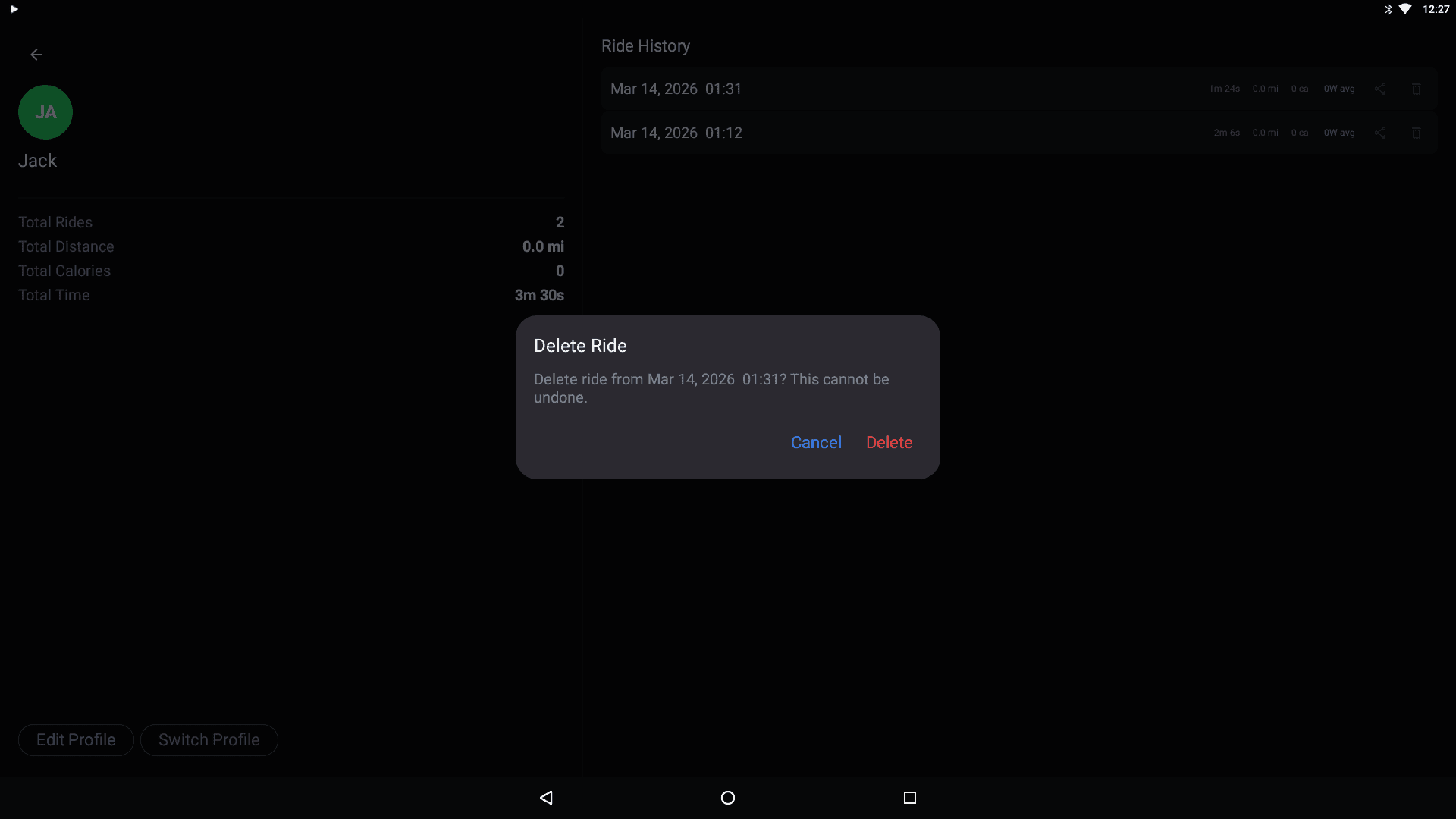 Tap the delete icon on any ride in the history list. A confirmation dialog will appear.