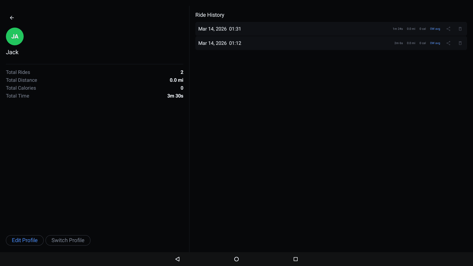 Each profile tracks a full ride history. From the dashboard, tap the profile icon in the top-right to view your profile stats and ride history.