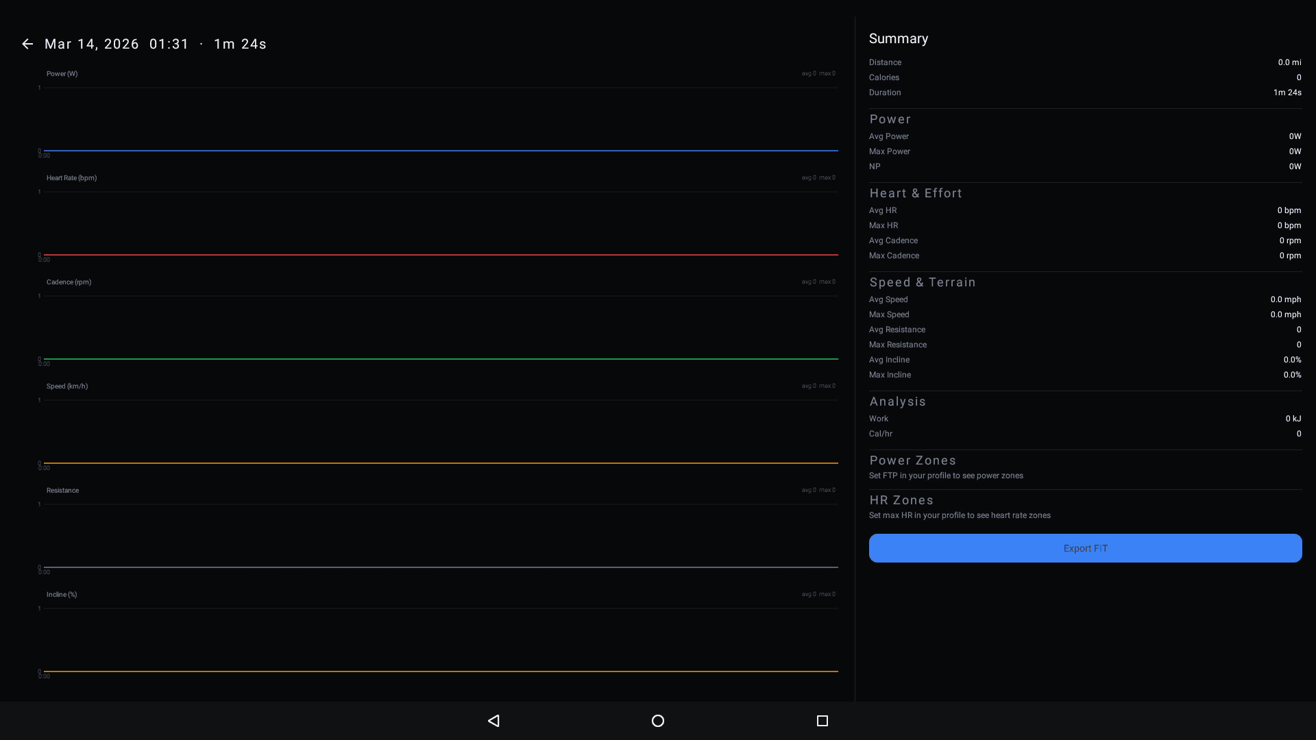 - Speed & Terrain — average/max speed, average/max resistance, average/max incline