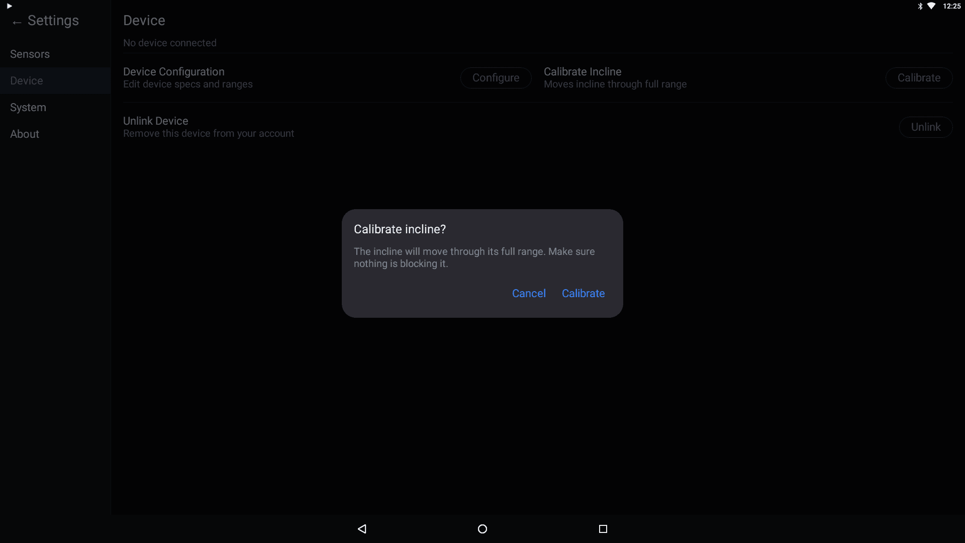 Tap Calibrate to run an incline calibration. The machine will move through its full range of motion to determine its incline limits.