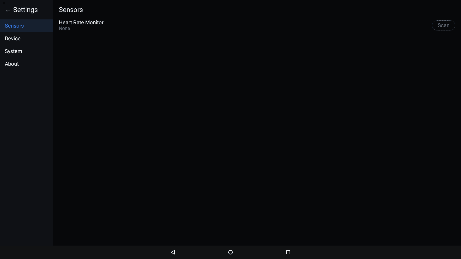 The Settings screen has four tabs in the left sidebar: Sensors, Device, System, and About.